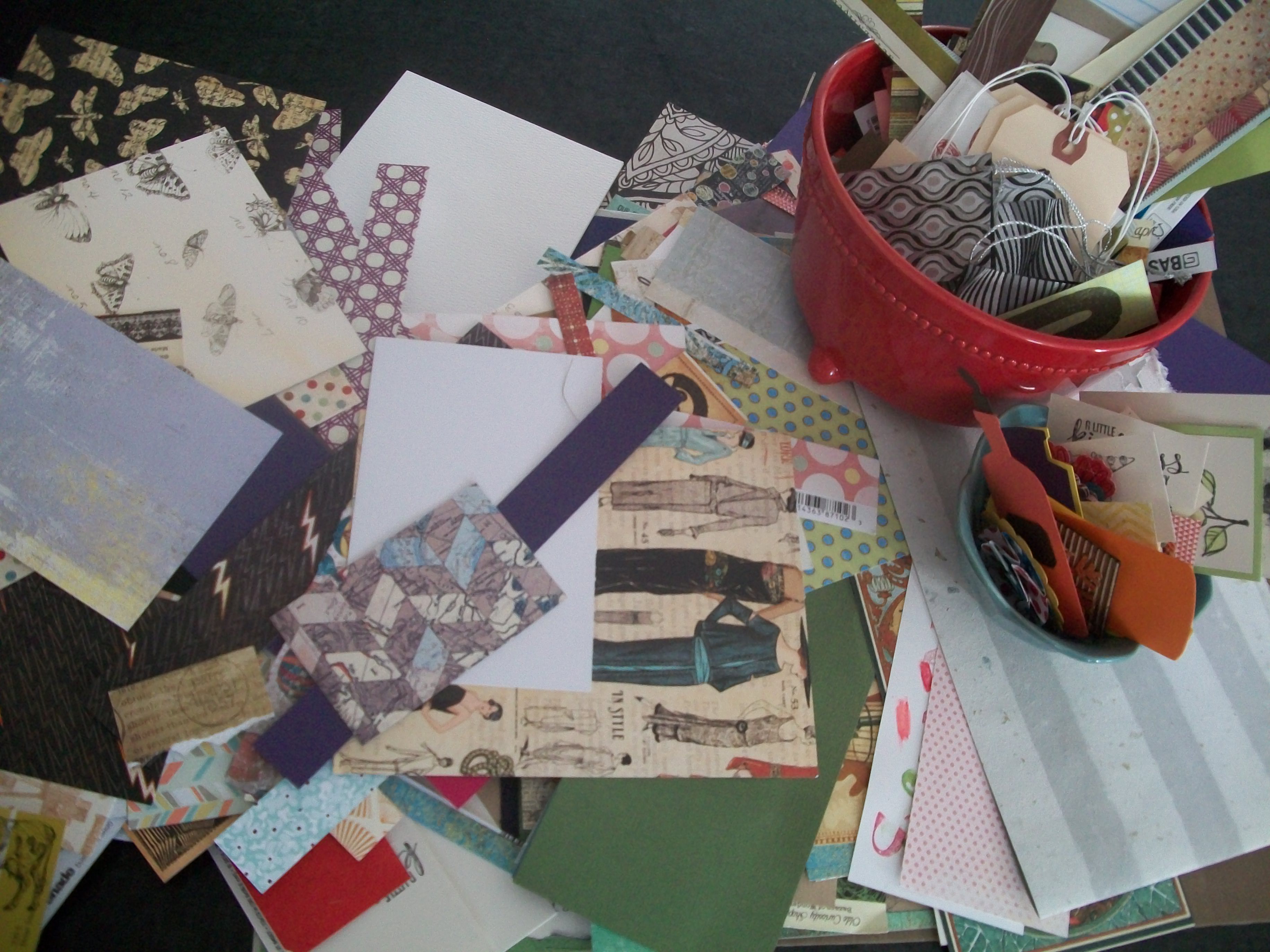 I have drawers, bags, bowls, and envelopes filled with scraps, and when it is a scrap day, I dump them all out on the counter and get to work. I tend to do all my backgrounds first and then dig out just a few rubber stamps (for my safety, I won’t go into the gluttonous amount of those I have hanging around) and start stamping.