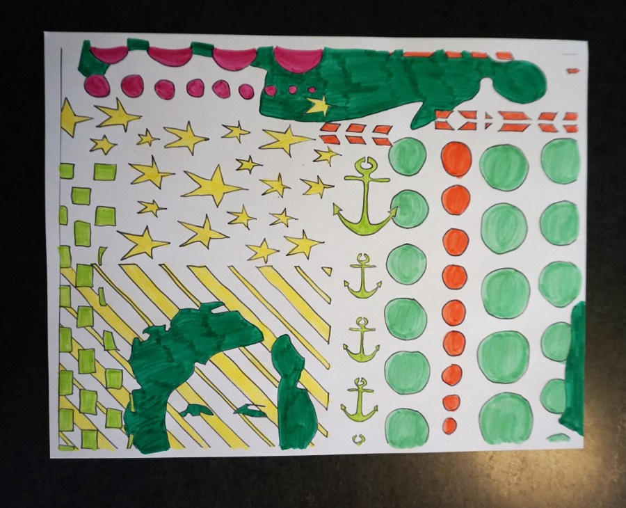 First step, trace stencils in pencil, be sure to overlap and fill in the whole sheet. I used a 12×12 piece of white cardstock. In retrospect, I probably should have used 8.5 X 11, but it worked.