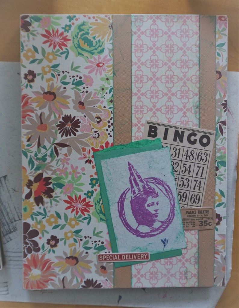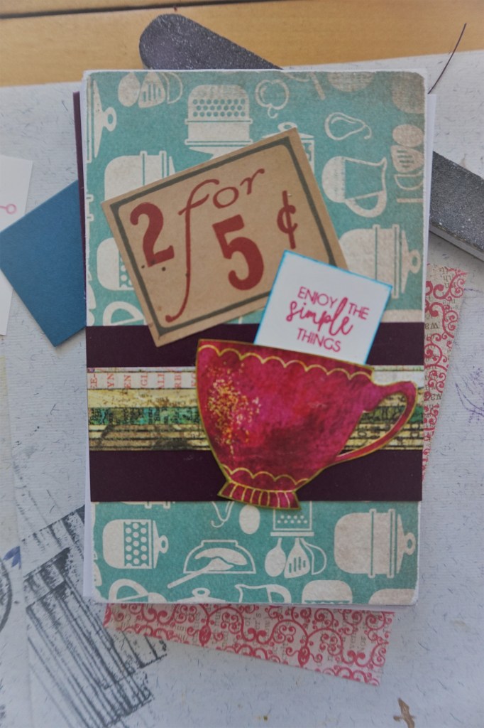 Same with this notebook, pink and turquoise, but what I like about this cover is the mix of patterns. There’s a lot going on, but adding the peachy orange behind the stamped image, ties it all in with the peachy belt across the center.