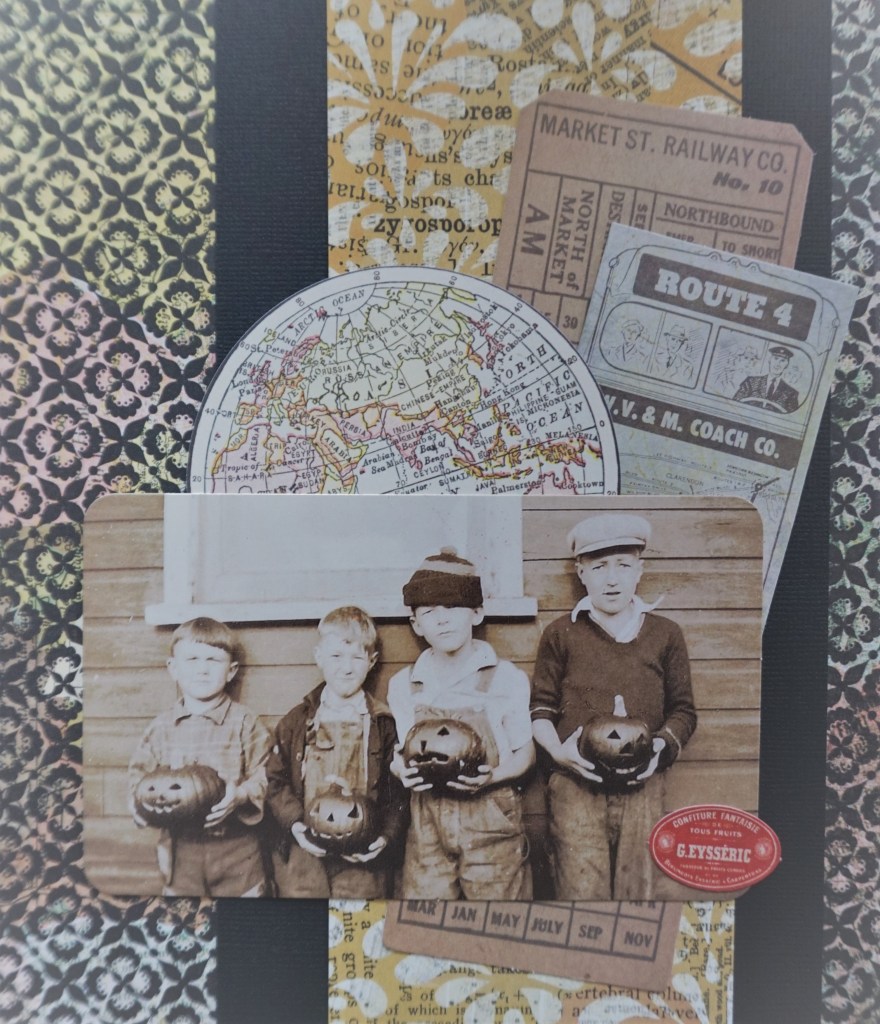 I really like using the Tim Holtz Idea-ology packs to layer in even more patterns. The Halloween kids photo is also a Tim Holtz product. I am always on the look out for original items like this that I can use, too.