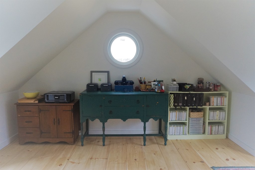 The layout of the space really came together. There were some pieces of furniture that I thought would show up that haven’t, like a goofy old green couch that we’ve had forever, and my Nana’s cool chair that I need to have reupholstered. And there are a few things that I thought I wouldn’t add, but have — my Grandpa’s old desk, Mom’s sewing table, this teal buffet that’s been in Pete’s family since the dawn of time. So far, I haven’t purchased any new pieces of furniture, which makes me very happy. I do think there is a new bookcase and maybe a bigger table in my futures, but these will suit for now.