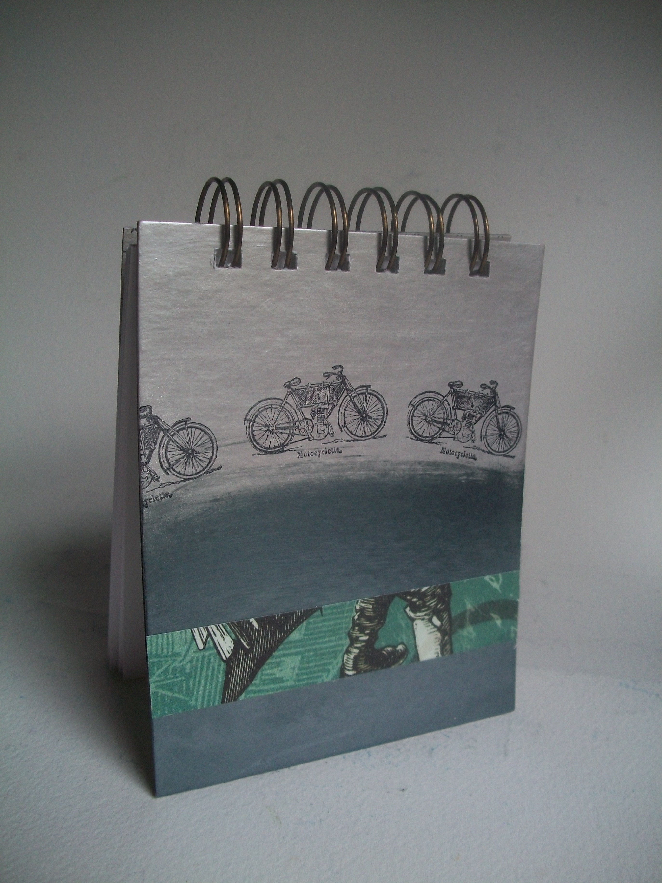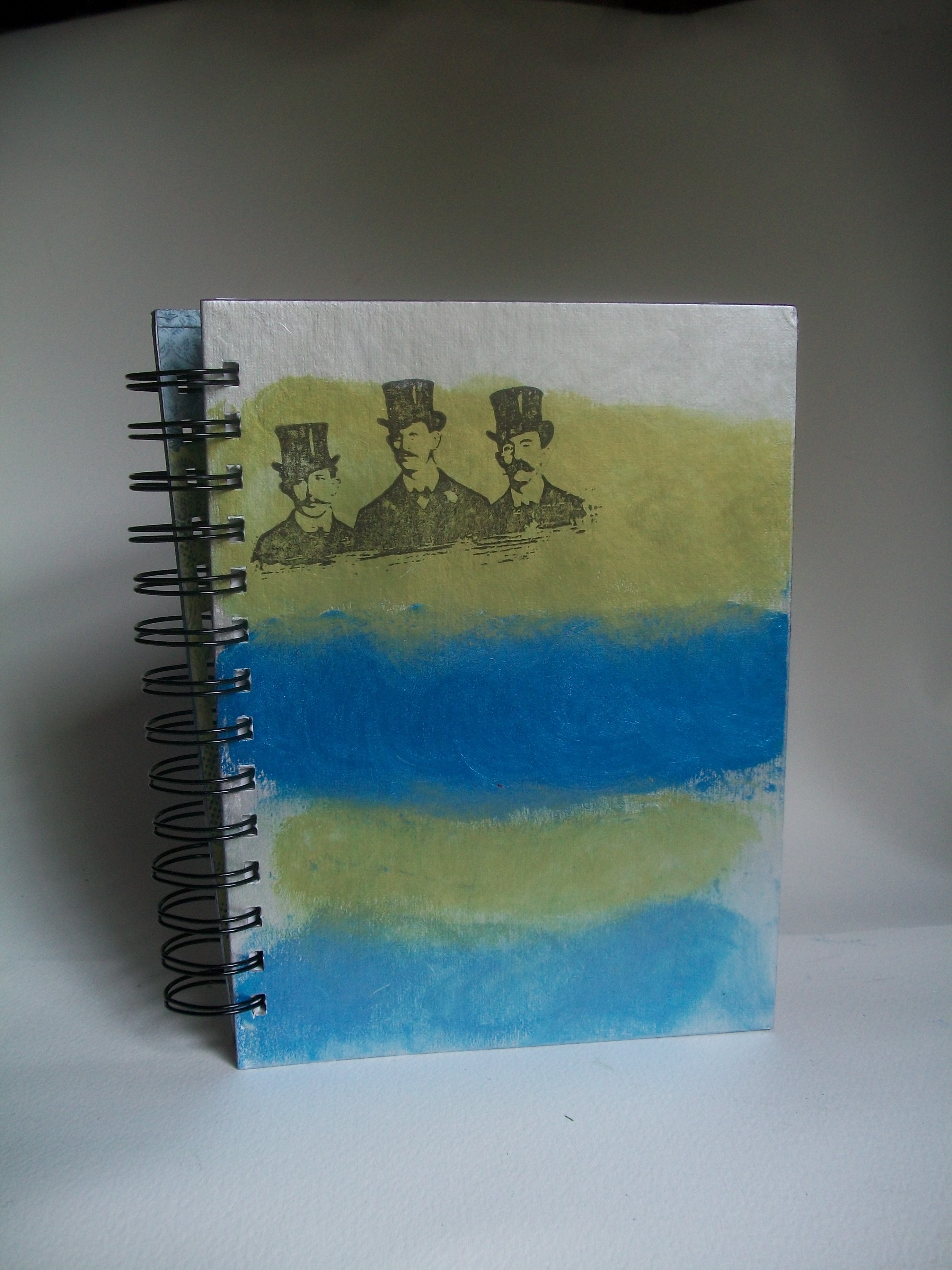 All journals are handmade with a variety of products including: card stock, patterned paper, rubber stamps, paint, stencils, and ephemera. All journals are also hand bound with a Zutter bind-it-all machine which creates the binding holes and crimps the spiral wire.